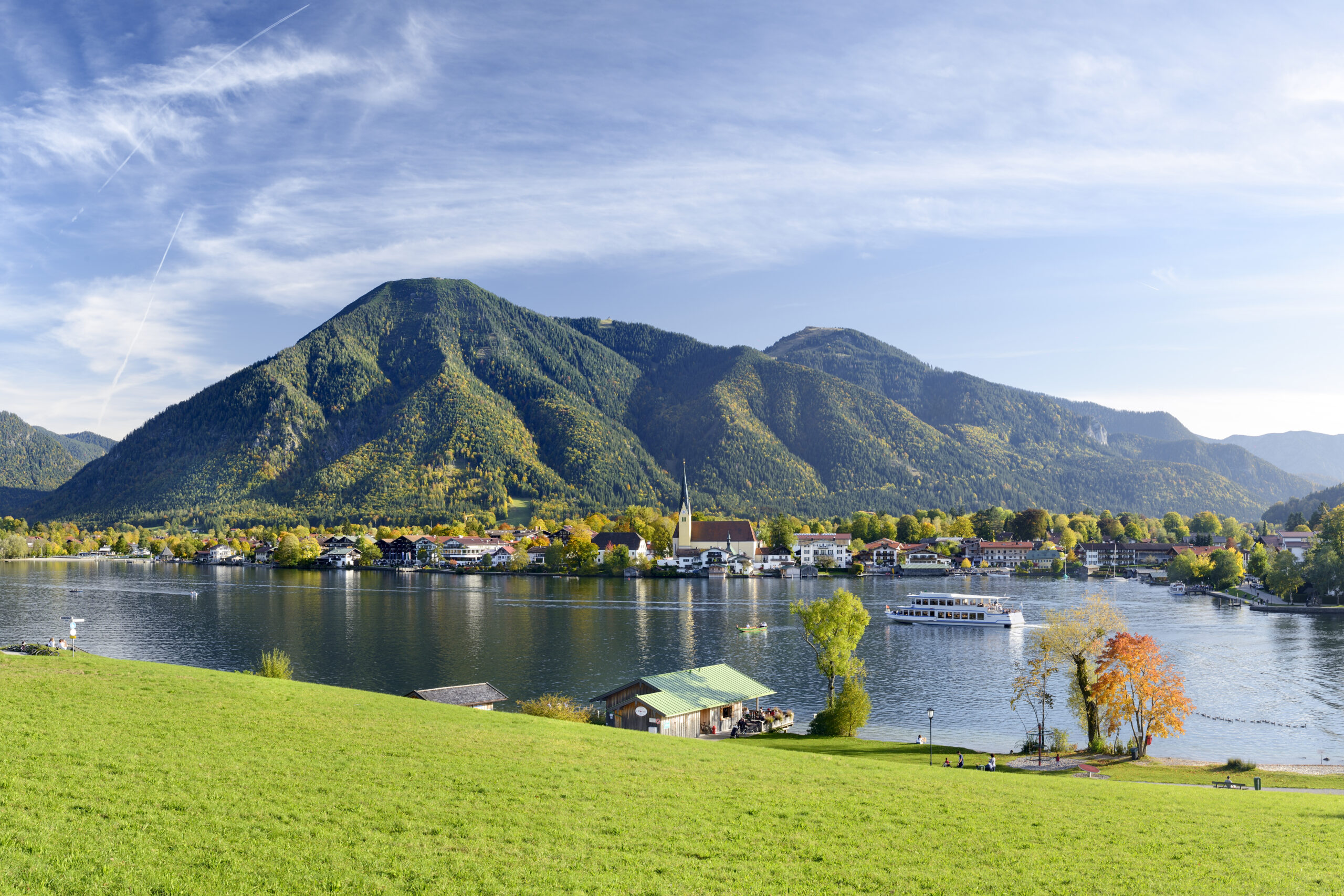- Bad Wiessee, Bayern, Deutschland – View over Tegernsee with Bad Wiessee and church Mariä Himmelfahrt with with Wallberg mountains in the background.
